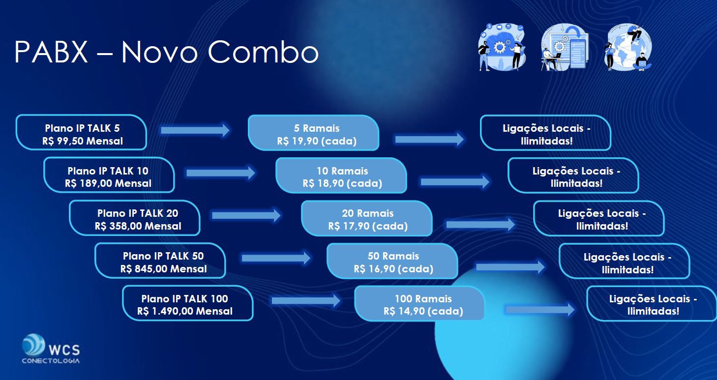 Conheça o Novo Combo IP Talk WCS, Planos Diferenciados por Quantidade de Ramais, Reduza Seus Custos de Telefonia Através de Um Pabx Cloud com Ligações Locais Ilimitadas, Clique no Botão WhatsApp ou no Consulte o Preço Que um Especialista de Imediato lhe Mostrará como Fazer Isto Através desta Solução.